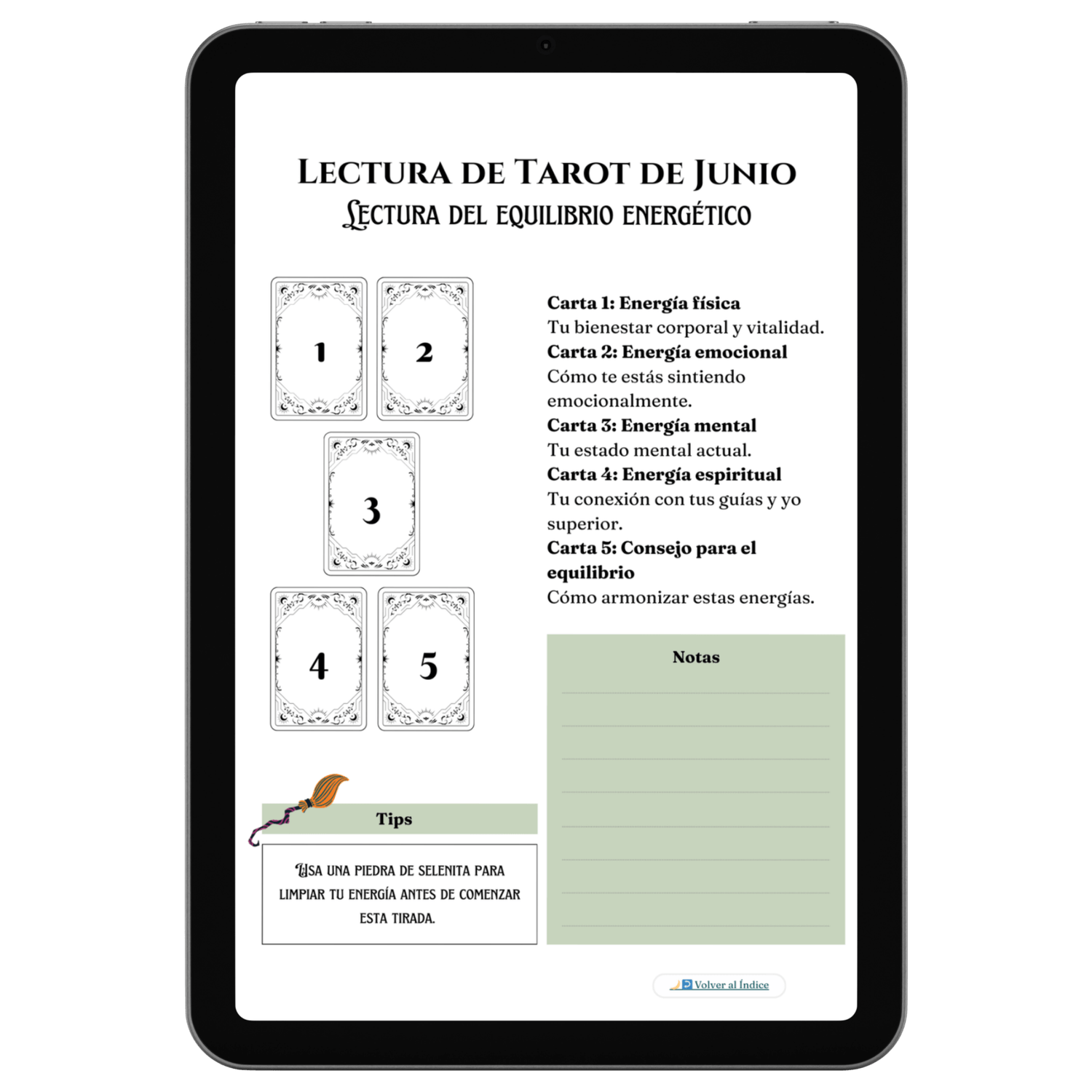 Te acompaña con espacios claros para tus tiradas, intenciones y reflexiones.