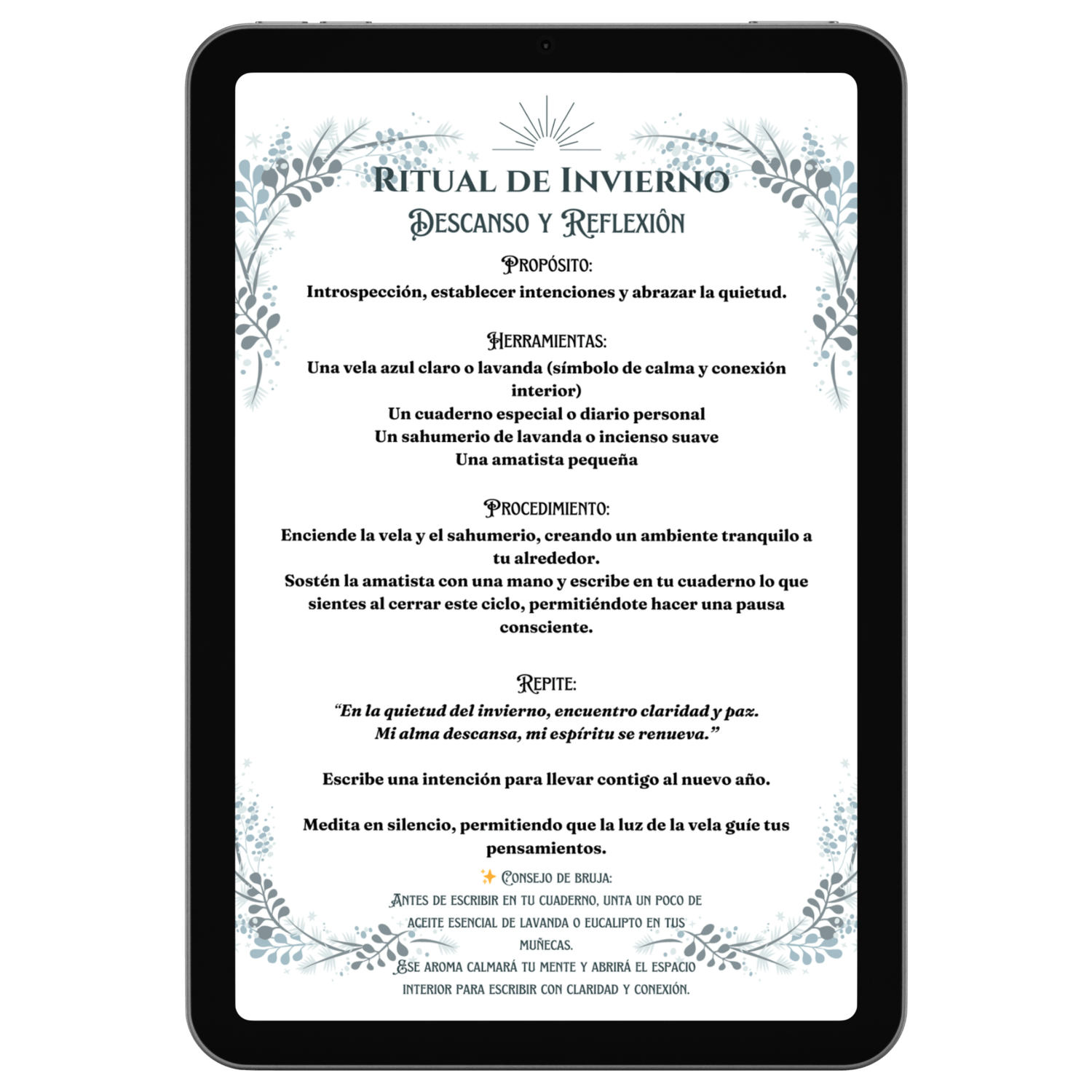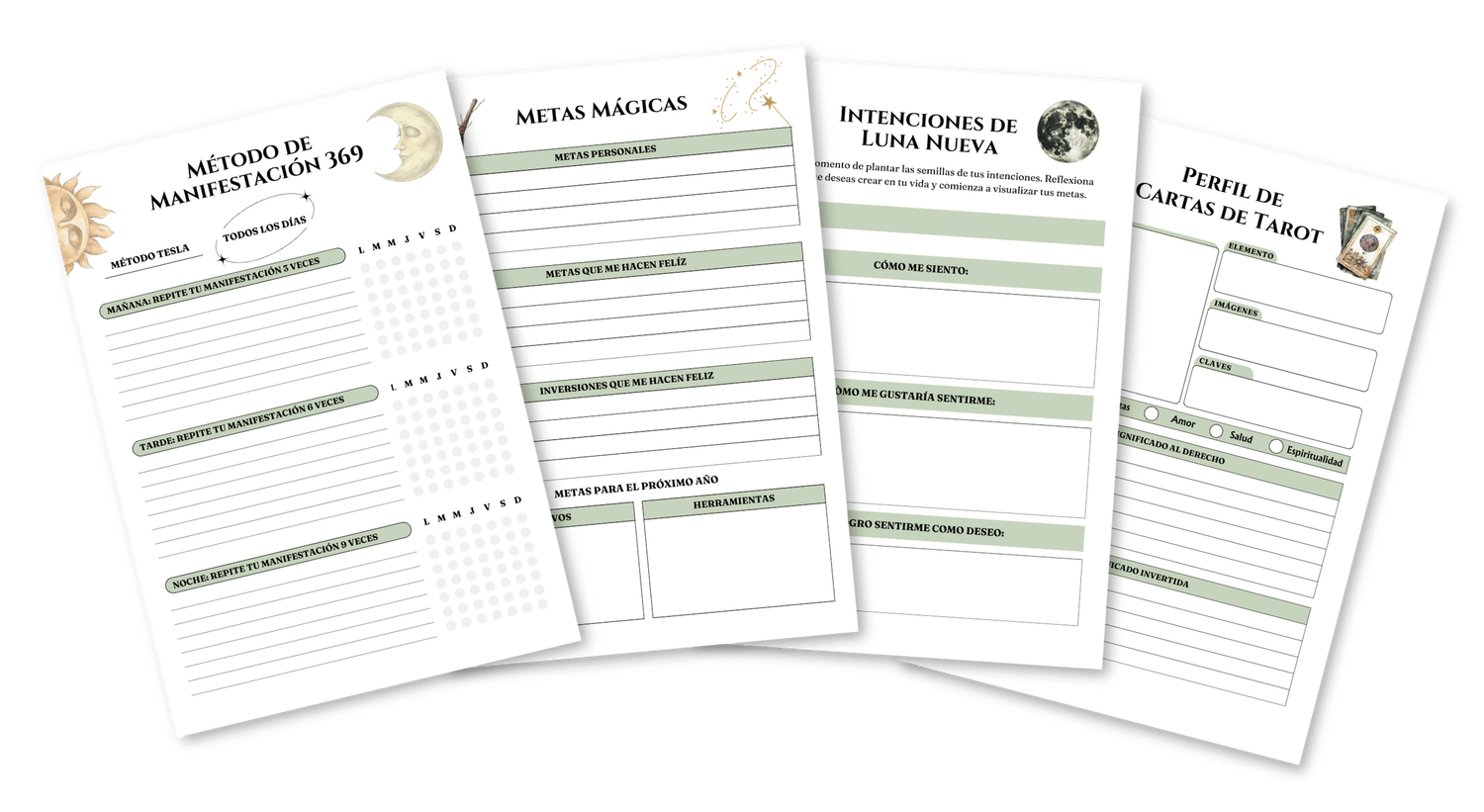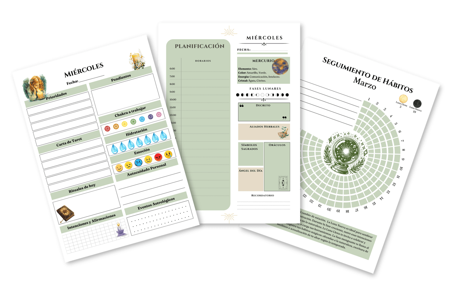 Esta agenda está diseñada para que tus prácticas energéticas tengan un lugar claro, ordenado y fácil de usar. Cada página te guía para registrar tus rituales, tus lunas, tus cartas y tu energía mes a mes.